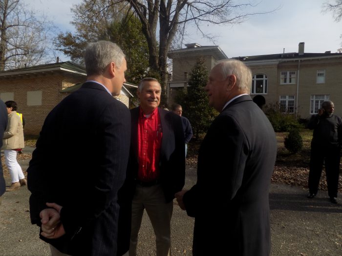 Photos: State and local officials and Jerry Hayes of Hayes Construction breaking ground; Stevens, Greer and Henry; Wirgau speaking with Tater and Matt Hayes.(McFarlin photos)