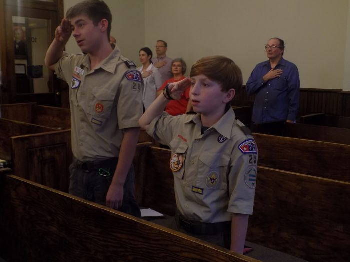 –The pledge of allegiance was led by Kenson Kyle and Levi Hamilton of Boy Scout Troop 28.