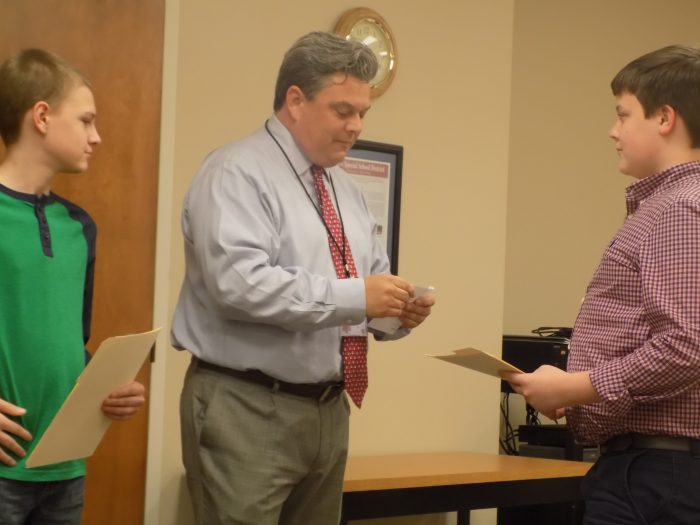 Building Principals introduced the Spelling Bee winners and runners-up to the board. From Paris Elementary, Chip Gray introduced runner-up Anna Daigle and winner Colby England. From Inman, Principal Jason Scarbrough introduced runner-up Toby McKinney and champion Lee Hayes.
