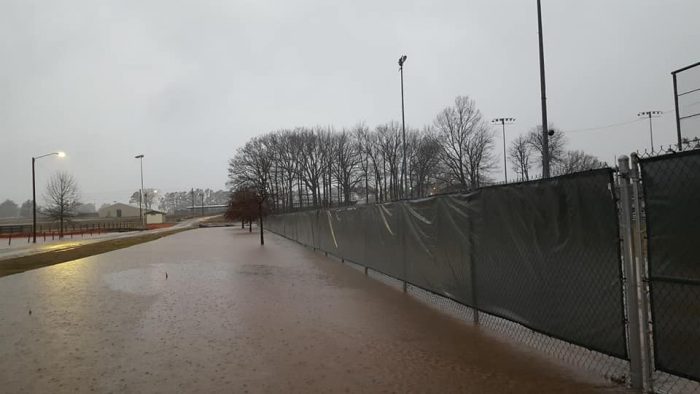 Union City, Tenn.—Heavy rainfall has flooded Graham Park in Union City, with most of the areas including tennis courts and ball fields underwater this morning. Robin Francis of Union City Turf Management said, “There’s not any real damage that we can see so far. We do have dormant sod down and it may float off” with more rain. “This will be a good test of the new drainage system, which is phase one, designed by the engineering firm TLM.” With even more rain expected over the weekend, Francis said, “We’ll be further assessing the situation as the day and rain continues.” (Robin Francis photos).