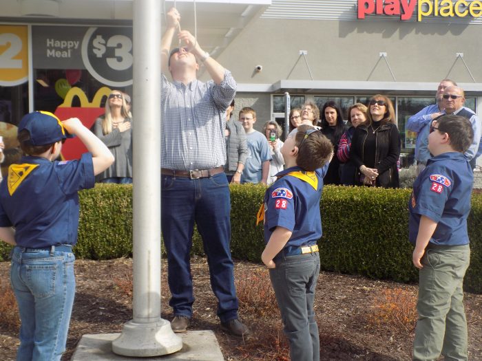 Paris, Tenn.—A large crowd was on hand for this morning’s Grand Re-Opening, 40th Anniversary and Flag-Raising at the Paris McDonald’s. Boy Scout Troop 28 members Wade Hayes, Luke Boyd and Fletcher Mooney were overseen by Matt Hayes in raising the flag while Chris Grant, Executive VP of the McWorth Management Corp. told the crowd that the team at McDonald’s “is so proud to be a part of the community.”