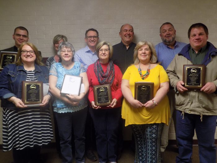 Photos: Jean Peterson, right, accepts a check for the Henry County Genealogy Society from Wendy Barnhart; the Top Ten fund raisers; Reginald Caldwell accepts a check for the Office on Aging. (Shannon McFarlin photos).