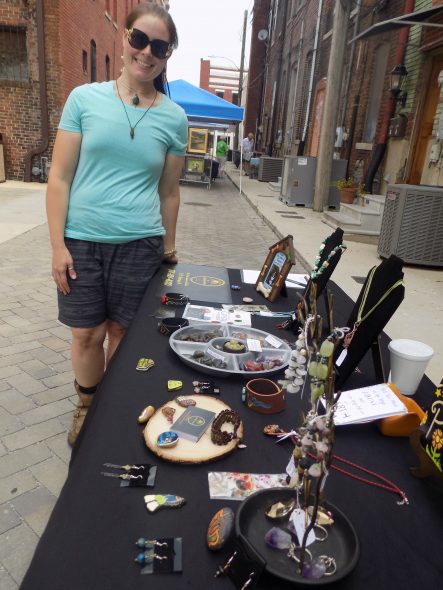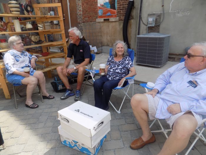 Paris, Tenn.—David and Michele Webb talk things over with Downtown Paris Association Director Kathy Ray and Artists Cat McGavin and Dan Knowles during Saturday morning’s West Alley Art Walk, the last event of this week’s Downtown Paris Week. Several artists displayed their art work in the west alley of the court square and Perry’s BBQ served lunches. In other photos, Kitty Carter displayed her wares from the new shop The Golden Cypress and Becky Hedges, Martin Paschall, McGavin and Gaines Hedges sit for awhile in the nice breeze. (Shannon McFarlin photos).