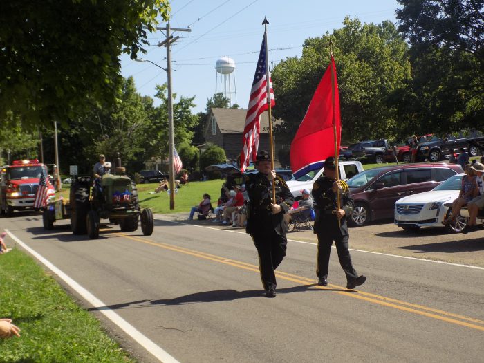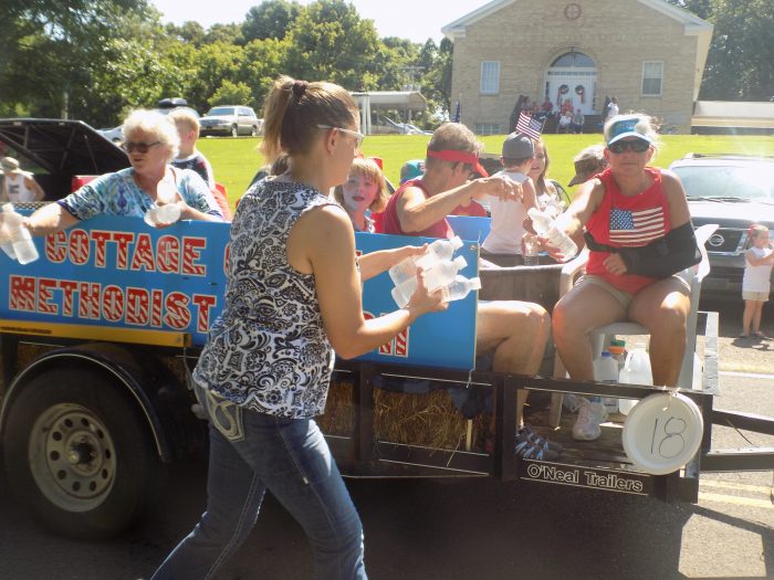 Cottage Grove, Tenn.—Henry Co. Mayor Brent Greer takes a playful shot at State Rep. Tim Wirgau in the dunking booth at Wednesday’s annual Cottage Grove Freedom Festival. With the heat index reaching 115 degrees in the morning, the dunking booth probably felt pretty good. Parade winners this year were: Best Of Parade—Cottage Grove Junior Firefighters; Best Float—Ables family; and Most Patriotic—Izzie Mellum as Lady Liberty. With the excessive heat, the crowd wasn’t as big as usual for the festivities and everyone was taking a lot of water and ice cream breaks. In other photos, Jan Foy and other members of the Cottage Grove United Methodist Church hand out free water; Henry County Sheriff’s Deputy Daniel Powell and Paris Firefighter Jason McCord in their hot uniforms leading the parade. (Shannon McFarlin photos).
