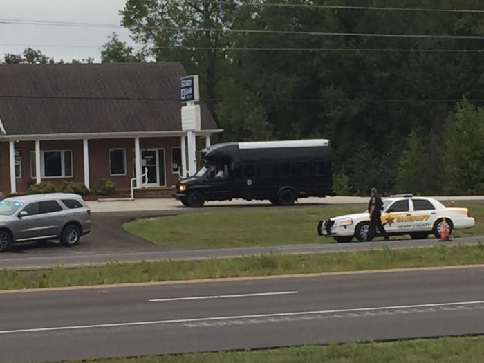 Upon Sheriff Belew’s arrival at the bank, he was able to clear the area of any immediate threat. “He then inspected the package and was able to see what he believed was an explosive device,” according to a press release issued this afternoon by the sheriff’s office.
