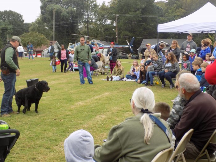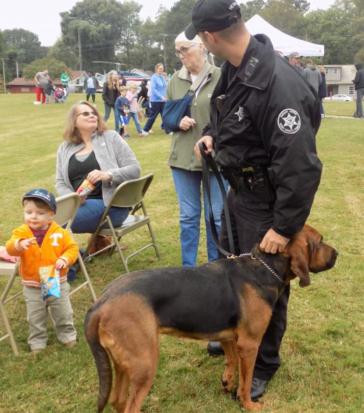 Paris, Tenn.–Little Jernigan Harris sees what it’s like in the pilot’s chair of an Air Evac helicopter while Base Line Pilot John Munson looks on at Saturday’s Atkins-Porter Neighborhood Fall Festival. Hundreds attended the all-day free festival, which included K-9 demonstrations from Sheriff Monte Belew and Si and Sgt. Wayne Fugua and Adora, all of whom participated in the recent manhunt in Stewart Co. There was plenty to do all day, with the sheriff’s department grilling hot dogs, cake walks, arts and crafts vendors, games, demonstrations by Air Evac, Paris Police, Paris Fire Department, National Guard, Henry County EMS, the Birds of Prey from Paris Landing State Park. Booths were set up by the health department, Youth Villages, Bethel University and more. In other photos, Belew, Captain Adam Jenkins and Si; Sgt. Fuqua with Adora; and cake walking. (Shannon McFarlin photos).