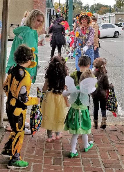 Paris, Tenn.–Visitors to the Henry Co. Clerk’s office were especially lucky this morning, with Jordan St. John handing out homemade cookies from Sweet Jordan’s along with the other treats being handed out for Halloween. The ladies at the clerk’s office are dressed like pirates, so St. John dressed like a parrot, too. Meanwhile, the ladies at the Paris Board of Public Utilities (BPU) are dressed like Disney characters. In photos, Jordan St. John hands a cookie to customer Veronica Banks at the Clerk’s Office, while “Snow White” (otherwise known as Raychel Sutherland) greets customers at the BPU; and the kids from the First Presbyterian Church pre-school went trick-or treating this morning. (Shannon McFarlin photos).