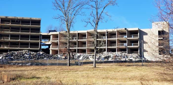 Buchanan, Tenn.—Workers have made significant progress in the demolition of the Paris Landing Inn since work began in mid-November. The main lobby area is now down and the frame of the portion that contained the hotel rooms is still standing, but much of the interior and windows has been removed and/or salvaged from that section. As WENK/WTPR reported last month, workers began dismantling the building beginning at the back of the building. New Park Manager Zach Tinkle said all the furniture and other items were removed from the facility before demolition began and have been given to other parks in the state. The Inn will be replaced by a more modern, but smaller facility. State officials have estimated the new Inn will be completed by 2020. (Shannon McFarlin photos).
