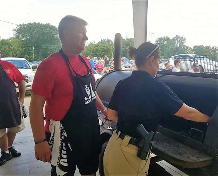 Organizer Michelle Brewer gives a hand to Sheriff’s Captain Steve Dean Sr. at the grill.