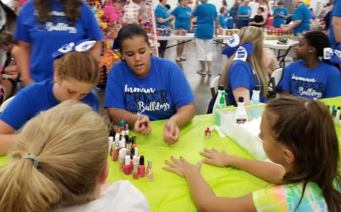 Inman cheerleaders paint fingernails for the younger girls.