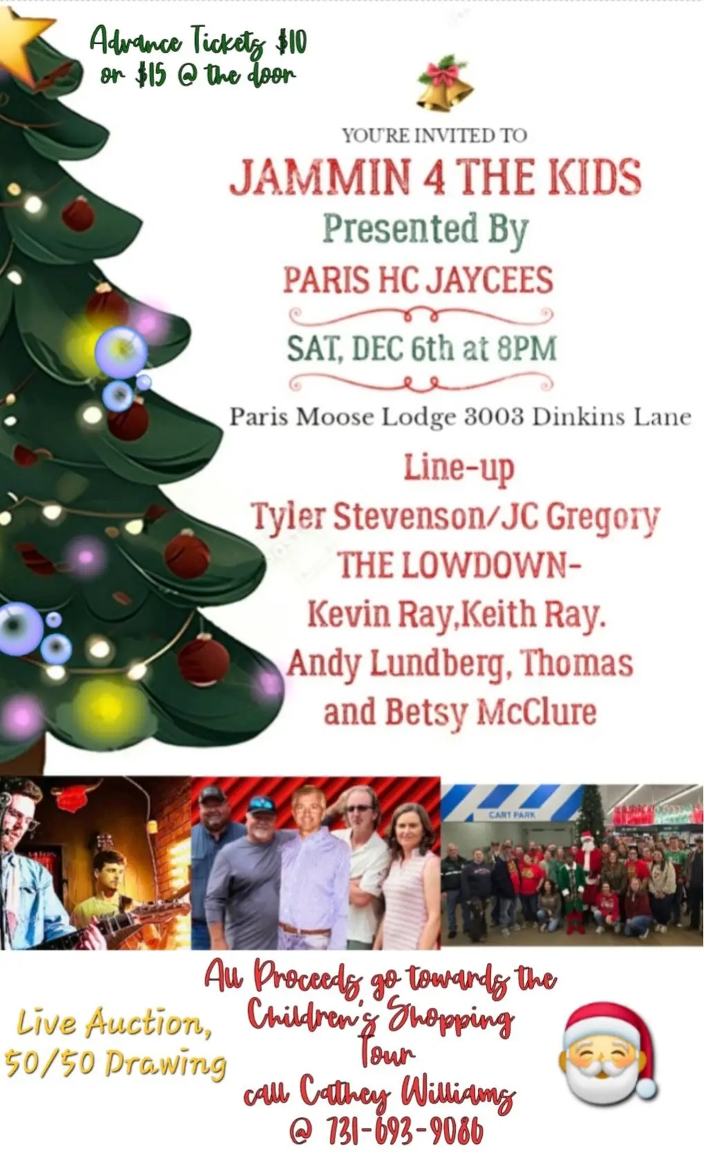 Paris-Henry County Jaycees present Jammin 4 the Kids, an annual fundraiser for its CHRISTmas shopping tour. Advance tickets for $10 go on sale this week. Contact 731-693-9086. Tickets will be $15.00 at the door. Event is 8 p.m. Saturday, December 6 at the Moose, 3003 Dinkins, Paris.