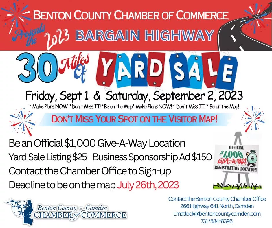 Bargain Highway will be here soon, contact the Benton County/Camden Chamber of Commerce and get your yard sale on the map!