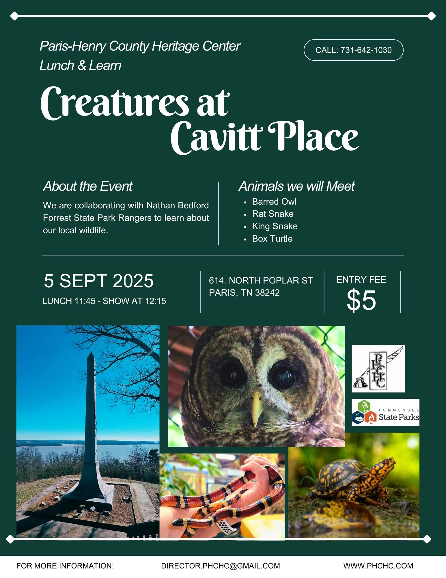 We are pleased to be hosting our next Lunch & Learn on Friday, Sept. 5th with the topic of our local wildlife. This will be something new and engaging as we are collaborating with Nathan Bedford Forrest State Park to learn about our local wildlife, see live animals brought to the Heritage Center and ask questions about what it’s like working with these amazing creatures.