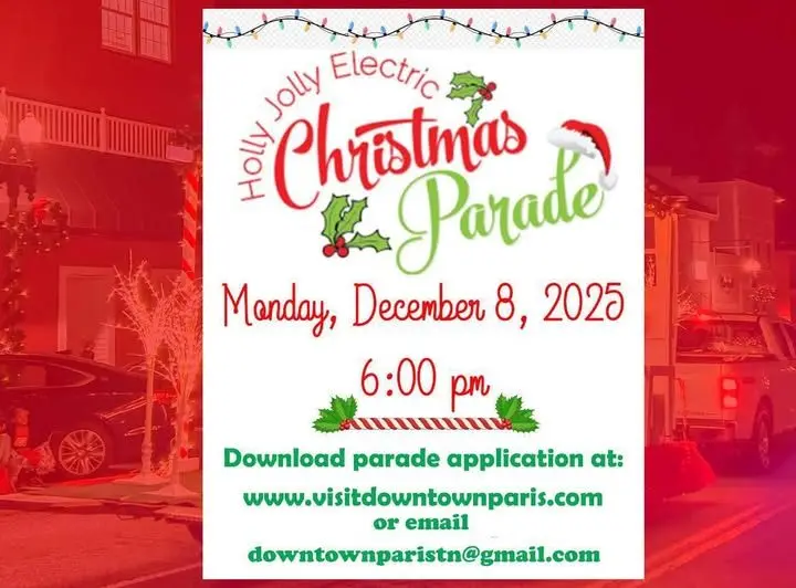 Join us Monday, December 8 at 6:00 pm as downtown Paris lights up with holiday cheer, sparkling floats, and Christmas magic for all ages!