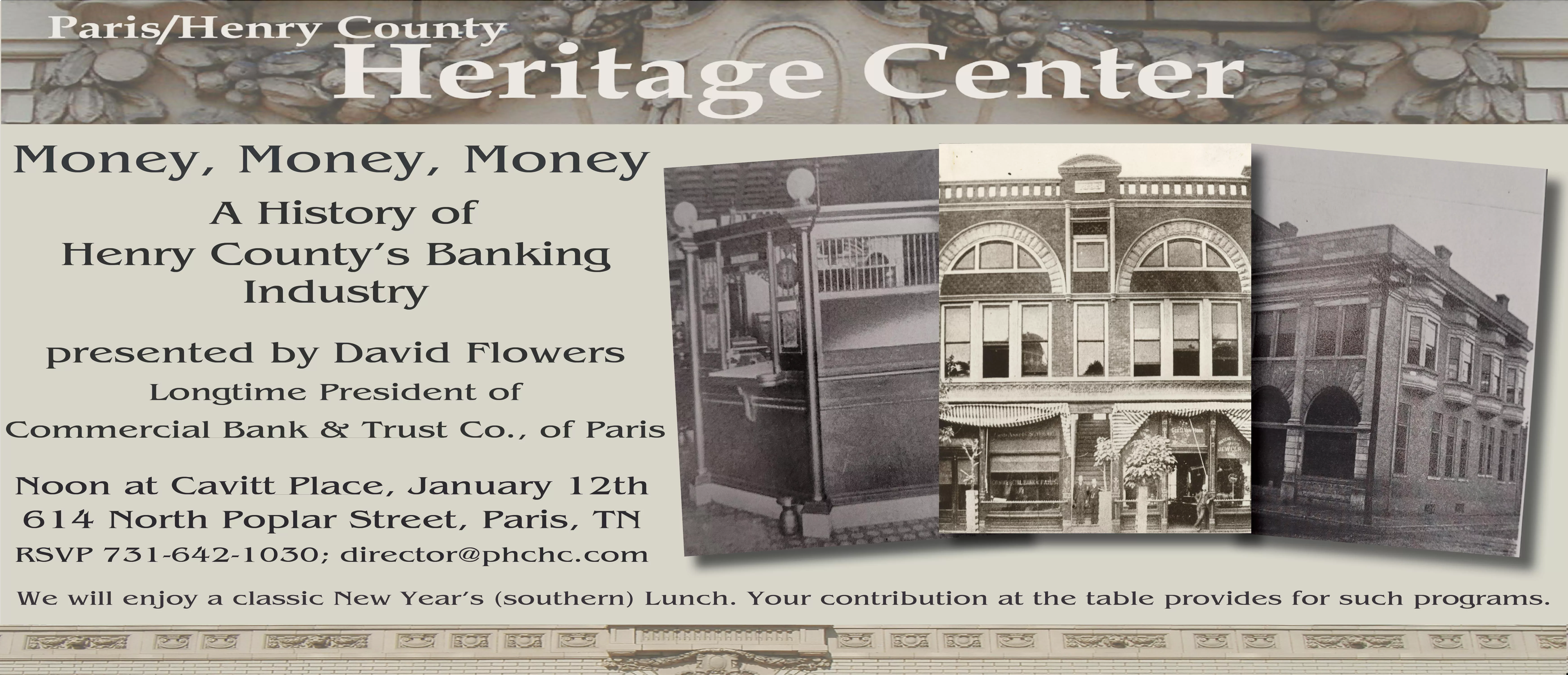 The first Lunch & Learn of the New Year will be held at noon January 12 at the Paris-Henry County Heritage Center. Former Commercial Bank & Trust President David Flowers will speak on the history of the local banking industry.