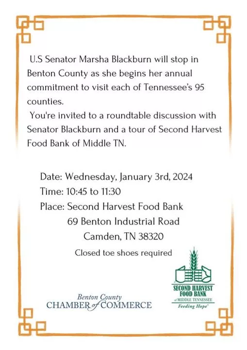 Camden, Tenn.–Congresswoman Marsha Blackburn will be visiting Benton County Wednesday as she begins her annual commitment to visit all 95 counties in Tennessee.
