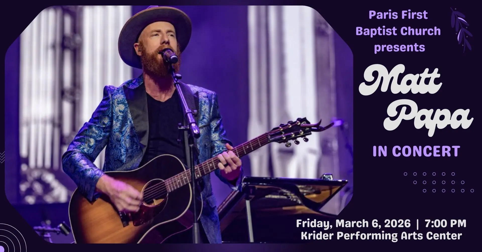Join us at KPAC on Friday, March 6 for Matt Papa – a Night of American Folk Songs and Hymns. Go to KriderCenter.com for more information.