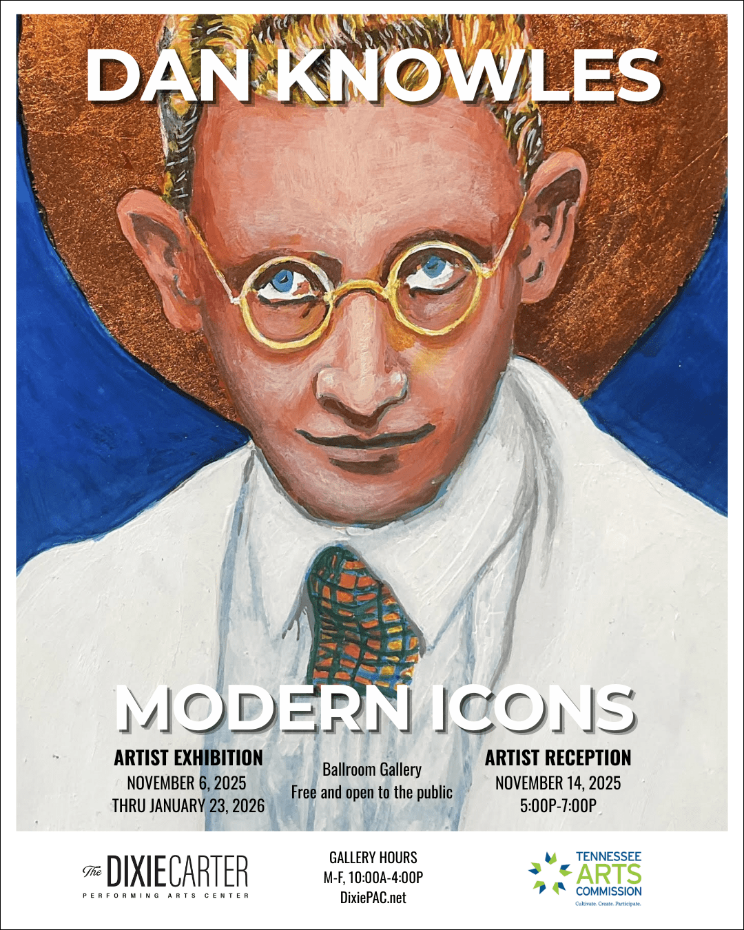 The Dixie Carter PAC’s Ballroom Gallery is proud to present Modern Icons, a new art exhibition by Paris, Tennessee artist and musician Dan Knowles, on display November 6, 2025 – January 23, 2026.
