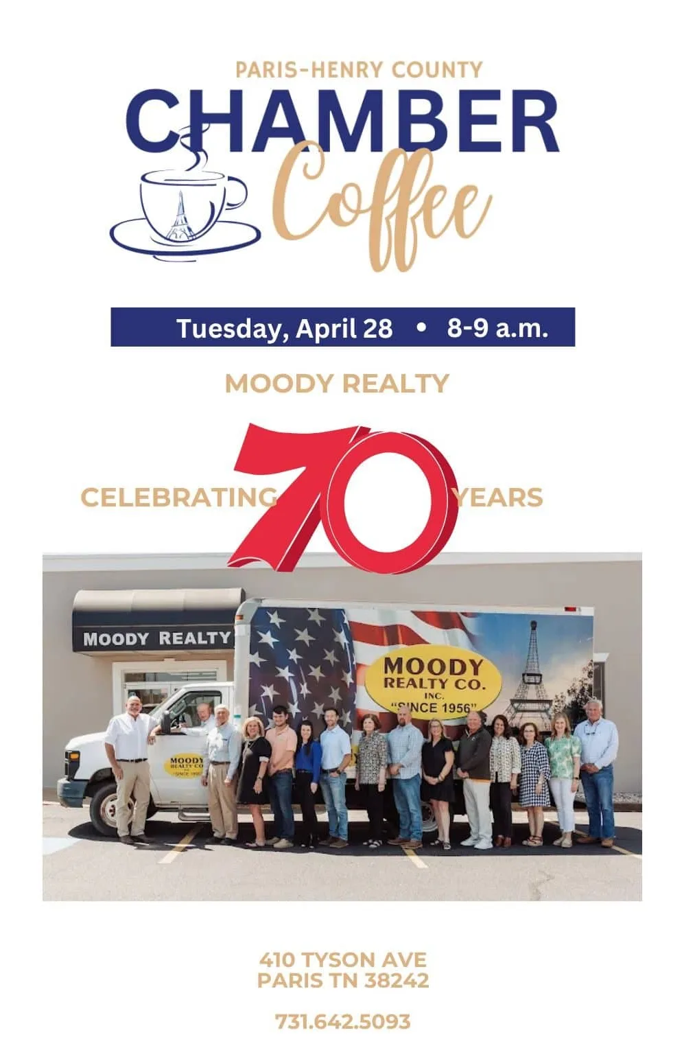 Tuesday, April 28th at 8 am will be a SPECIAL Chamber Coffee at Moody Realty Co. Inc. celebrating their 70th year in business!