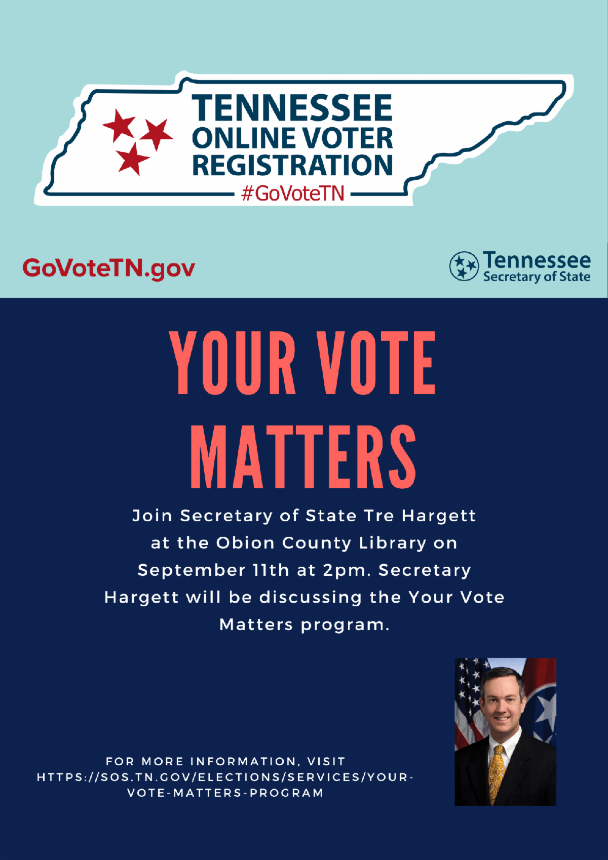 Union City, Tenn.–Tennessee Secretary of State Tre Hargett will be at the Obion County Library at 2 p.m. September 11 to discuss the ‘Your Vote Matters’ program. The public is invited.
